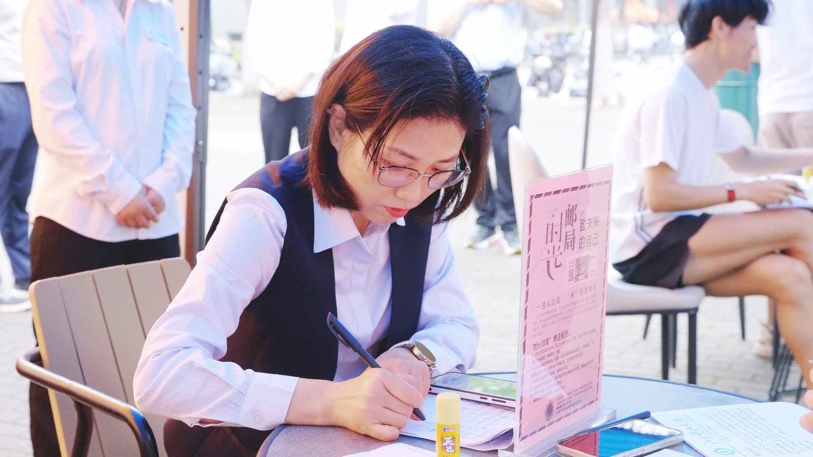 活動(dòng)現(xiàn)場(chǎng),畢業(yè)生們圍聚在這里,有的托腮沉思,有的嘴角含笑,紛紛拿起筆,在信紙上寫下對(duì)未來(lái)的寄語(yǔ),把對(duì)校園的眷戀都留在了信里。墨痕中流淌著絲絲深情,筆尖上勾勒著美好未來(lái)。